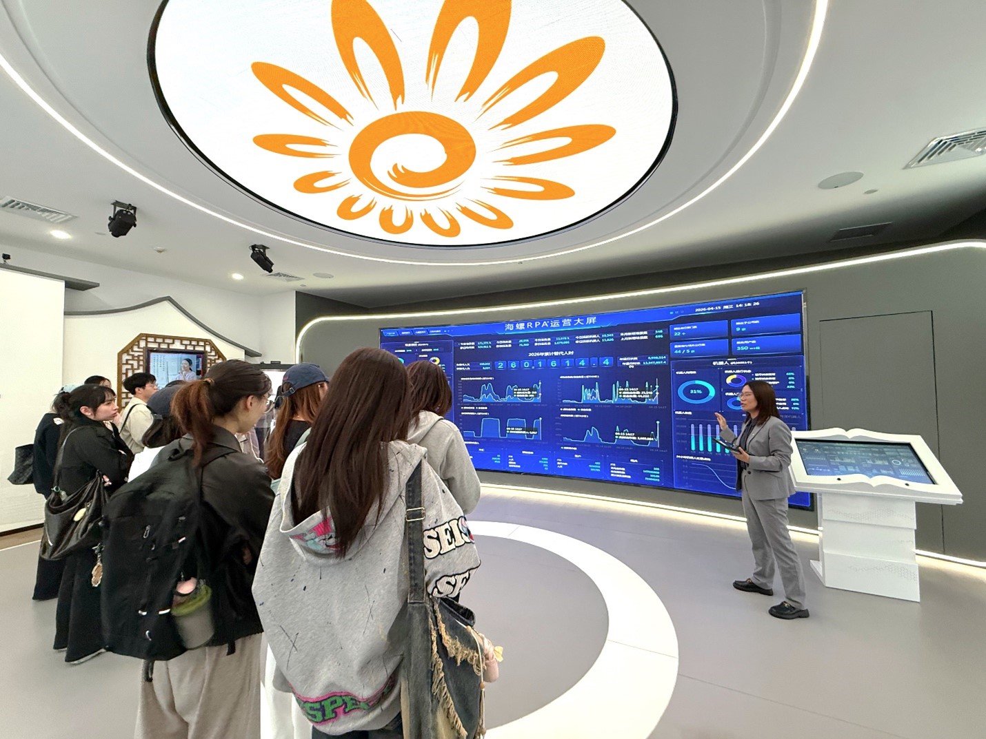 参访期间,招商银行独墅湖支行副行长徐一帆、厅堂主管刘郑耀热情接待到访师生,并带来专业内容分享。在展厅参观环节,招商银行信息技术部张莉娜围绕数字金融创新应用展开系统讲解,重点介绍了招行自主研发的海螺 RPA流程自动化工具。该工具通过模拟人工操作,实现业务流程自动化执行与高效处理,广泛应用于数据处理、报表生成、后台运营等场景,大幅提升运营效率,有效降低人为操作风险。