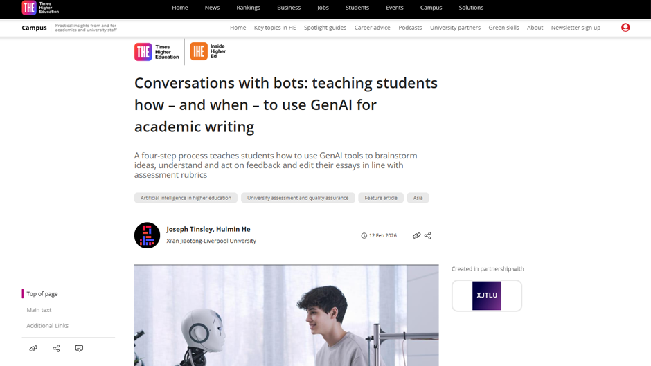 导读:2月12日,西交利物浦大学教育发展部的Joseph Tinsley老师和英语语言中心的何惠敏老师在英国媒体泰晤士高等教育上发表文章,介绍了他们为本科生学术写作课程设计的一套结构化四步教学法。该方法涵盖写作目的、观点生成、反馈互动与校对修改四个环节,实践表明,在有指导的练习中给予学生充分空间去尝试AI工具,能获得最佳学习效果。