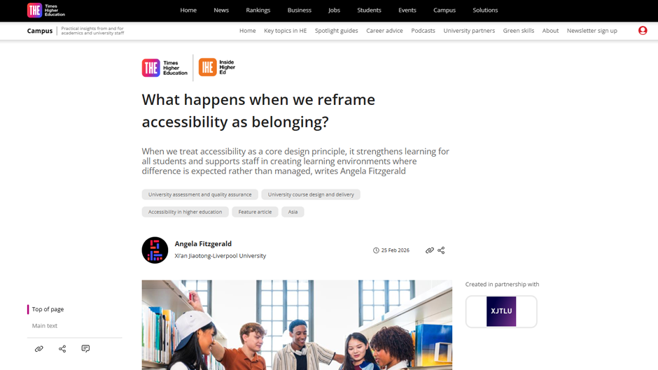 导读:2月25日,西交利物浦大学未来教育学院教育研究系Angela Fitzgerald教授在英国媒体泰晤士高等教育上发表文章指出,大学虽有各种无障碍支持政策,但许多学生仍感到自己难以真正融入课堂。问题在于,这些支持往往是事后补救式的——学生先遇到困难,再申请特殊安排。