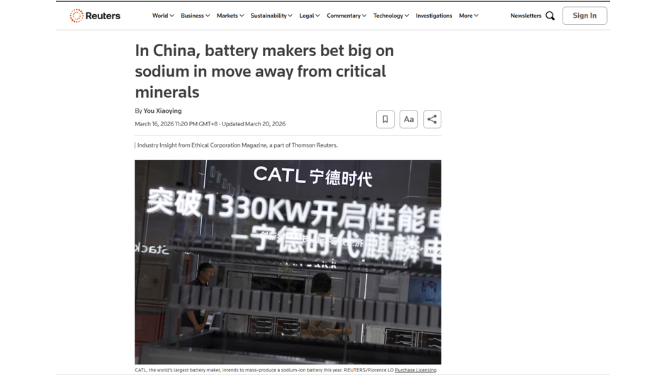 路透社:中国电池制造商重点布局钠离子技术,以减少对关键矿产的依赖(英国)