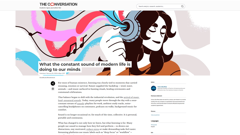 导读:2月26日,西交利物浦大学创业与企业港副教授Victor Pérez博士在The Conversation上发表文章指出,人类的聆听方式已经从过去偶尔发生、与自然相连的共享体验,转变为一种持续不断、个性化的声音流。如今,人们利用音乐和音频来调节情绪、提升专注力和生产力,但这种“随时在线”的声音环境也可能挤占安静的空间,减少反思的机会,并在不知不觉中影响我们的思维方式和应对能力。