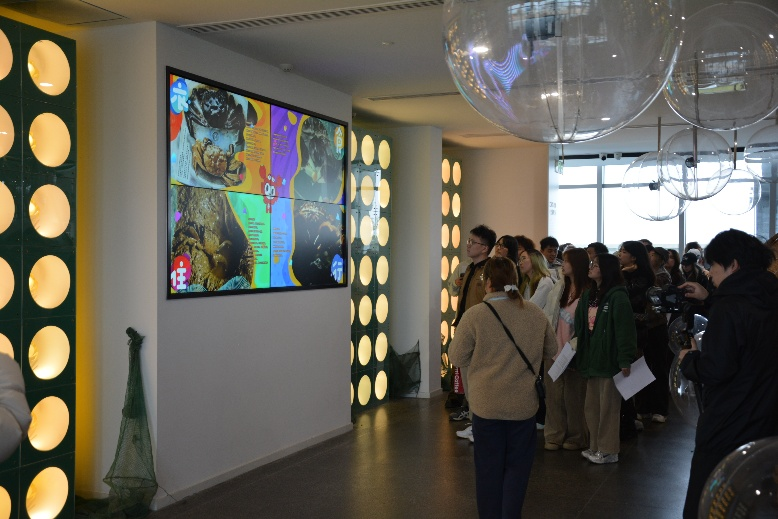 在大闸蟹文化博物馆,师生们系统了解了阳澄湖大闸蟹的品牌历史与产业文化。博物馆以时间为轴,通过实物陈列、影像资料、互动装置等多种展陈方式,生动呈现了阳澄湖大闸蟹从传统捕捞到规模化养殖、从地方物产到国家级品牌的演进历程。学生们在参观过程中,就大闸蟹品牌传播和地方农文旅融合发展等话题与讲解人员、镇政府工作人员进行了深入的交流。