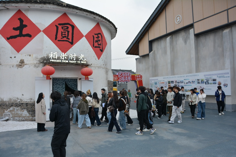 随后,师生们来到仓坊——一处由传统粮仓改造而来的文化创意空间。在这里,学生们实地考察了地方产业的空间更新与运营模式。仓坊在保留原有建筑风貌与结构特征的基础上,通过功能置换与空间再造,引入了文创展示、手工体验、轻餐饮等新业态,成为集文化消费与社区服务于一体的复合型空间。学生们围绕既有建筑改造策略、业态组合逻辑等问题展开讨论,尝试从乡镇可持续发展的视角理解存量资源活化利用的创新、可行路径。