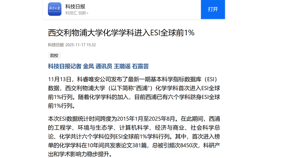 《科技日报》:西交利物浦大学化学学科进入ESI全球前1%
