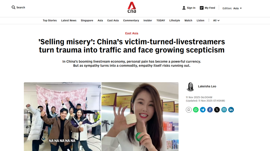亚洲新闻台:“贩卖苦难”|受害者变身主播 将创伤转化为流量引发质疑(新加坡)