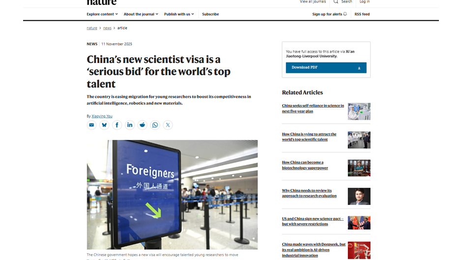 《自然》杂志:中国推出“科学家签证”,招揽全球顶尖人才(英国)