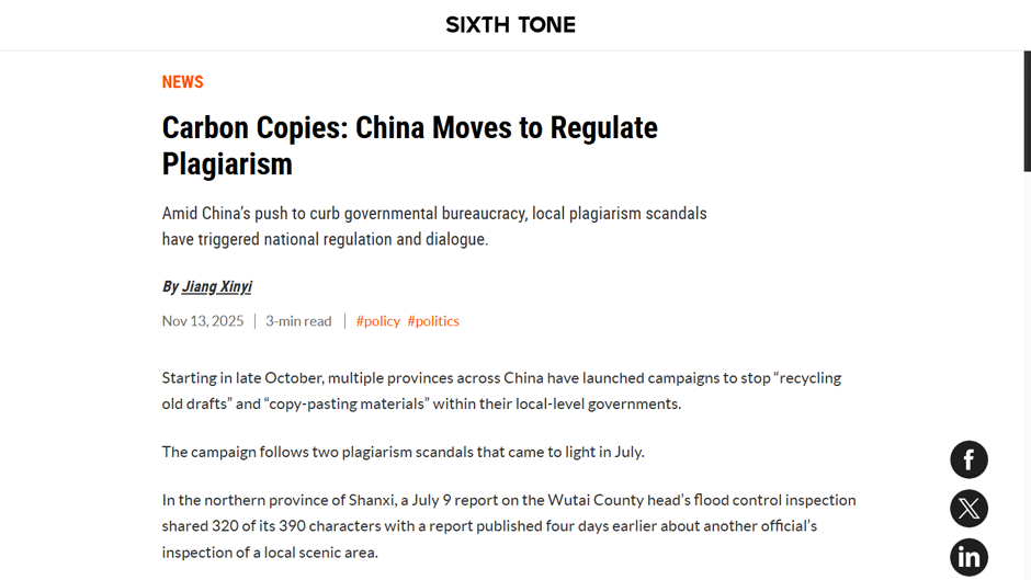 导读:据Six Tone 11月13日报道,中国正推进政府公文抄袭问题专项整治。对此,西交利物浦大学人文社科学院陈均逢博士在接受Sixth Tone采访时表示,根本原因在于晋升体制太看重“书面材料”,而基层调研的资源又不够,结果大家就陷入了“形式主义的陷阱”。