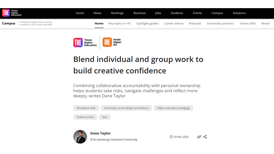 导读:据英国媒体泰晤士高等教育11月10日报道,一种融合小组协作与个人创作的创新教学法,正帮助创意专业的学生建立自信,并在项目中进行更大胆的尝试。该方法由西交利物浦大学影视与创意科技学院声音课程讲师Dane Taylor设计,旨在引导学生从共同协作过渡到独立创作。