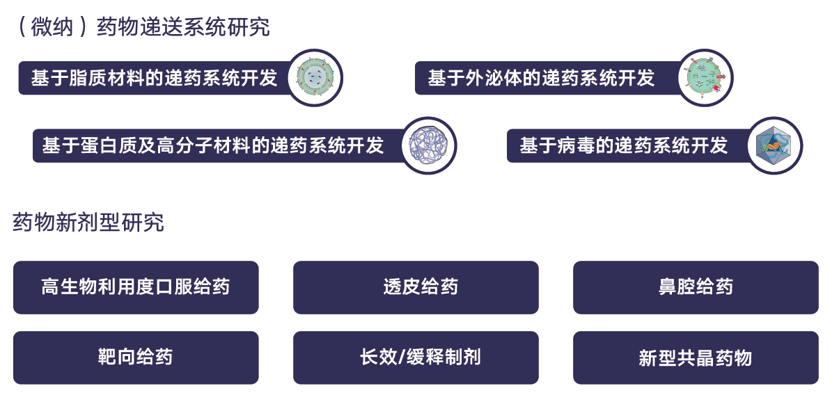 旨在创立一个集创新性,专业性和综合性于一体的研究平台,针对目前递药系统的不足进行优化研究,开发针对小分子化药、大分子生物药等合适的药物递送系统,以及相应的新型药物剂型和递送新策略,以适应不同的临床需求和提高药物的稳定性及生物利用度。