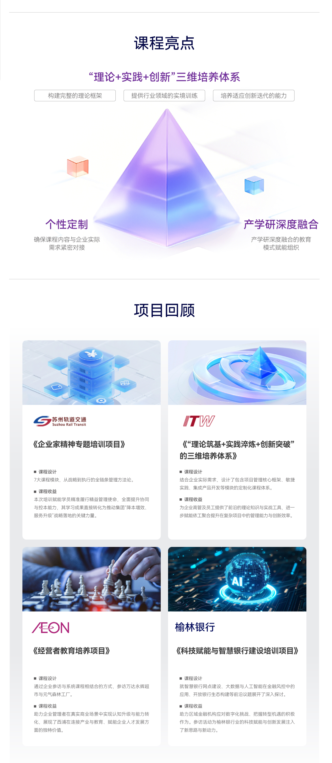 为不同发展阶段的企业、不同诉求的管理者提供多元、立体、可持续的知识更新解决方案。精准匹配企业期望与平台专业优势,将先进管理思想与行业实践相结合,为企业量身锻造学习方案,助力企业持续创新与发展。