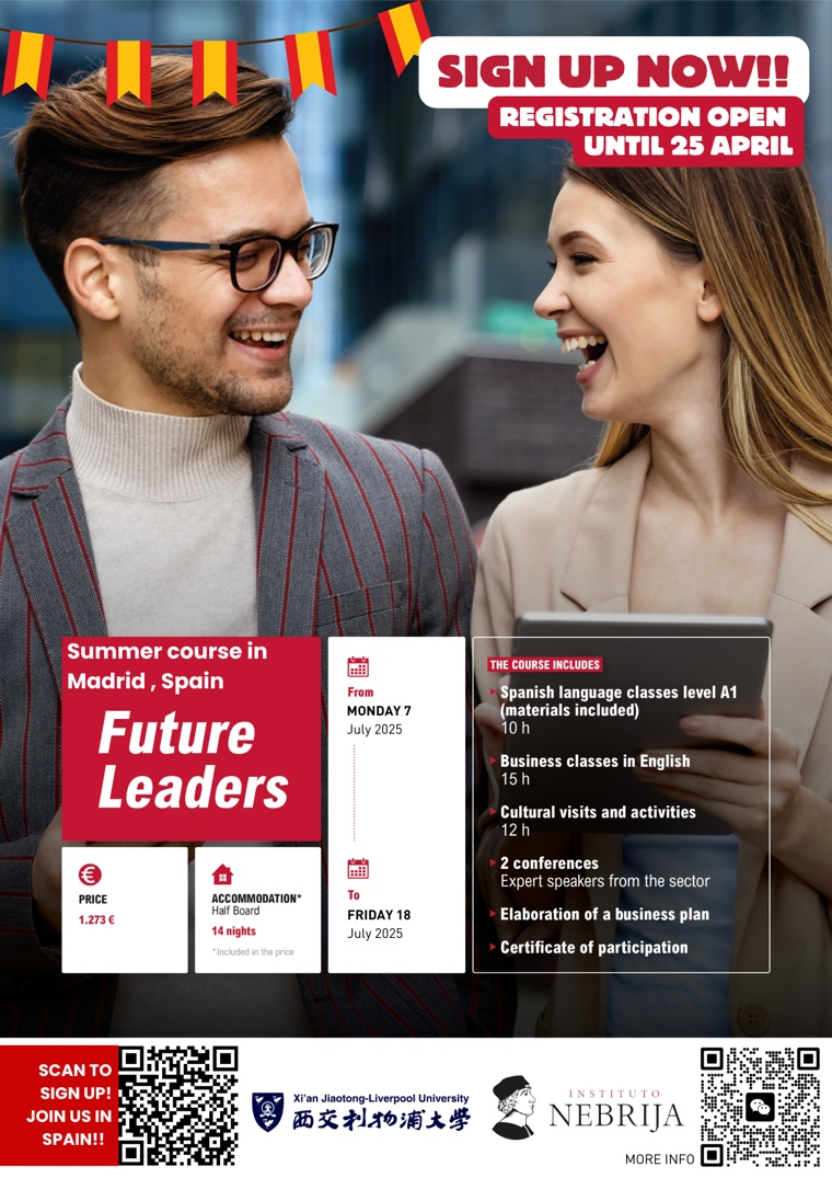 专为商科学生设计的2周马德里学习体验: ✓ 商务西班牙语课程 ✓ 名企参访(桑坦德银行、Inditex集团等) ✓ 行业领袖讲座 ✓ 文化实践活动 每年6-7月(暑期)或12-1月(冬季)开放申请。